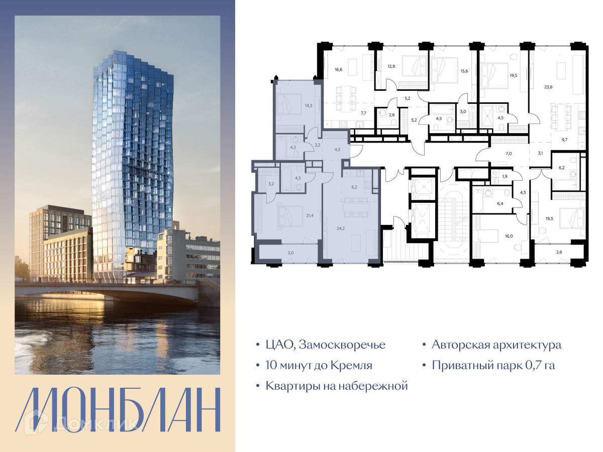 Элитный жилой комплекс «Монблан» — новый проект от ГК «Галс-Девелопмент» в сердце Замоскворечья. Проект расположен напротив Дома музыки, прямо у воды, на Шлюзовой набережной. Притягательный район, где исторические памятники и гладь Москвы-реки соседствуют с современными зданиями. Поездка от нового дома до Кремля займёт 10 минут по живописным историческим набережным города. «Монблан» становится носителем новых ценностей, ярким фронтменом «Павелецкой», который приходит на смену архитектурным символам начала тысячелетия. В архитектуре комплекса органично сочетаются среднеэтажная застройка вдоль набережной, формирующая новый детально проработанный речной фасад и яркая высотная башня, обладающая запоминающимся скульптурным силуэтом. Во внутреннем дворе «Монблан» создано живописное пейзажное пространство — настоящий приватный бионический парк площадью почти 7 тыс. м². Более половины территории отдано под озеленение. Парковая часть начинается с амфитеатра — событийного пространства для жителей с гибкой функцией, где могут проходить мероприятия для жителей. Далее в сердце парка — большая площадка-плейхаб для детей разных возрастов. В глубине — зона коворкинга на свежем воздухе, которая может использоваться круглый год. На территории также расположена спортивная площадка, зеленый тоннель-берсо и прогулочные дорожки. Первые этажи дома отданы под премиальный ресторан, кофейню и торговую галерею. Всего в проекте представлена 341 квартира, помимо классических квартир в проекте есть уникальные жилые форматы с особой эстетикой: квартиры с личными террасами площадью до 62 м² и пентхаусы площадью до 228 м² с потолками 4,35 метров на последних этажах. Все квартиры сдаются без отделки.