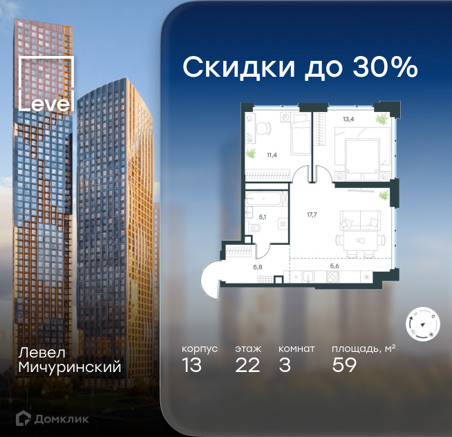 Level Мичуринский 一 новый жилой комплекс бизнес-класса, расположенный вдоль русла реки Очаковки по адресу Озерная улица, владение 7. Проект находится в одном из самых зеленых и престижных районов Очаково-Матвеевское (ЗАО) в 10 минутах пешком от станции метро «Мичуринский проспект». В рамках проекта будут возведены 10 корпусов высотой до 54 этажей, число квартир 一 3140. Внутренняя инфраструктура На территории квартала будут построены три детских сада и школа. Они будут сданы одновременно с окончанием строительства. На первых этажах домов откроются магазины, кафе, аптеки. Мы тщательно отбираем ритейл, чтобы всё необходимое было буквально в двух шагах. Инфраструктура района В 15-минутной доступности на авто более 30 детских садов (из них 14 в пешей доступности), 32 школы (из них 13 в пешей доступности) и 14 вузов. Также в ближайшем окружении более 37 медицинских учреждений, 10 спортивных клубов и 22 продуктовых супермаркета. В 10-минутной доступности на велосипеде расположено пять парков со скверами и детскими площадками 一 например, Очаковский, где можно прогуляться по деревянным пешеходным дорожкам и спуститься к реке по оборудованным террасным спускам. До заказника «Долина реки Очаковки» и собственной благоустроенной набережной можно будет дойти пешком всего за 1 минуту. Благоустройство Чтобы вы наслаждались каждым моментом и могли воплотить максимум сценариев для работы и отдыха, мы благоустраиваем 4,7 га территории. Главная достопримечательность 一 видовой мост, который будет начинаться на уровне земли, проходить через весь двор и постепенно подниматься до эксплуатируемой кровли с тихими пространствами для релаксации и отдыха. Еще одно креативное решение 一 вертикальная досуговая площадка вдоль стены стилобата. Она будет иметь несколько этажей, соединенных лестницами, лифтами и пандусами. По сути, это многоуровневый лабиринт с детскими и рекреационными площадками. Скалодром, горки, качели, системы для лазания — пространство для игр и полёта детской фантазии и энергии. Архитектура Level Мичуринский притягивает взгляды и завораживает каждой гранью. Расположение корпусов и фасады вдохновлены окружением проекта — выразительный ландшафт, перепады высот, близость воды. Концептуальная доминанта архитектуры — тектоника воды, отражающей солнечный свет. Пластика фасадов напоминает рябь на воде в ветреный день, стекло отражает и преломляет свет, а нарочито неровные окружности на двух корпусах — это напоминание об озёрах района, давших название и улице, на которой он строится. В проекте представлен широкий выбор планировочных решений от студий (21 кв. м.) до пентхаусов (249 кв. м.) с высотой потолков до 6,3 м, а также трехсторонние квартиры с панорамными окнами.