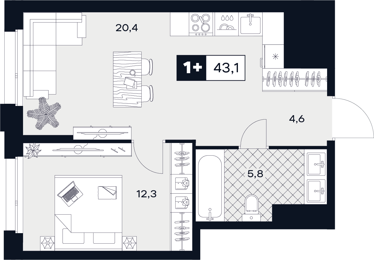 - Общая площадь: 43.1 м²