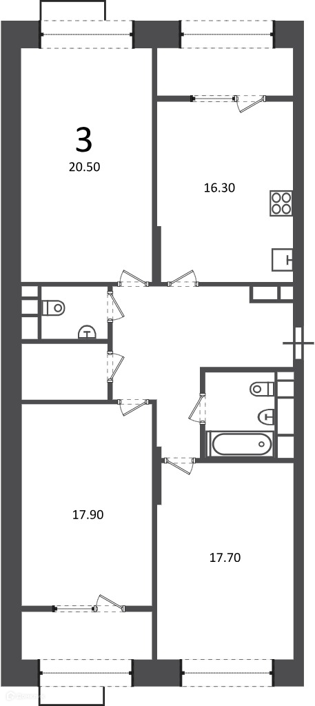 - Количество комнат: 3-комнатная квартира