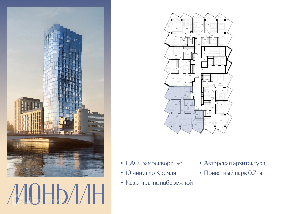 Элитный жилой комплекс «Монблан» — новый проект от ГК «Галс-Девелопмент» в сердце Замоскворечья. Проект расположен напротив Дома музыки, прямо у воды, на Шлюзовой набережной. Притягательный район, где исторические памятники и гладь Москвы-реки соседствуют с современными зданиями. Поездка от нового дома до Кремля займёт 10 минут по живописным историческим набережным города. «Монблан» становится носителем новых ценностей, ярким фронтменом «Павелецкой», который приходит на смену архитектурным символам начала тысячелетия. В архитектуре комплекса органично сочетаются среднеэтажная застройка вдоль набережной, формирующая новый детально проработанный речной фасад и яркая высотная башня, обладающая запоминающимся скульптурным силуэтом. Во внутреннем дворе «Монблан» создано живописное пейзажное пространство — настоящий приватный бионический парк площадью почти 7 тыс. м². Более половины территории отдано под озеленение. Парковая часть начинается с амфитеатра — событийного пространства для жителей с гибкой функцией, где могут проходить мероприятия для жителей. Далее в сердце парка — большая площадка-плейхаб для детей разных возрастов. В глубине — зона коворкинга на свежем воздухе, которая может использоваться круглый год. На территории также расположена спортивная площадка, зеленый тоннель-берсо и прогулочные дорожки. Первые этажи дома отданы под премиальный ресторан, кофейню и торговую галерею. Всего в проекте представлена 341 квартира, помимо классических квартир в проекте есть уникальные жилые форматы с особой эстетикой: квартиры с личными террасами площадью до 62 м² и пентхаусы площадью до 228 м² с потолками 4,35 метров на последних этажах. Все квартиры сдаются без отделки.
