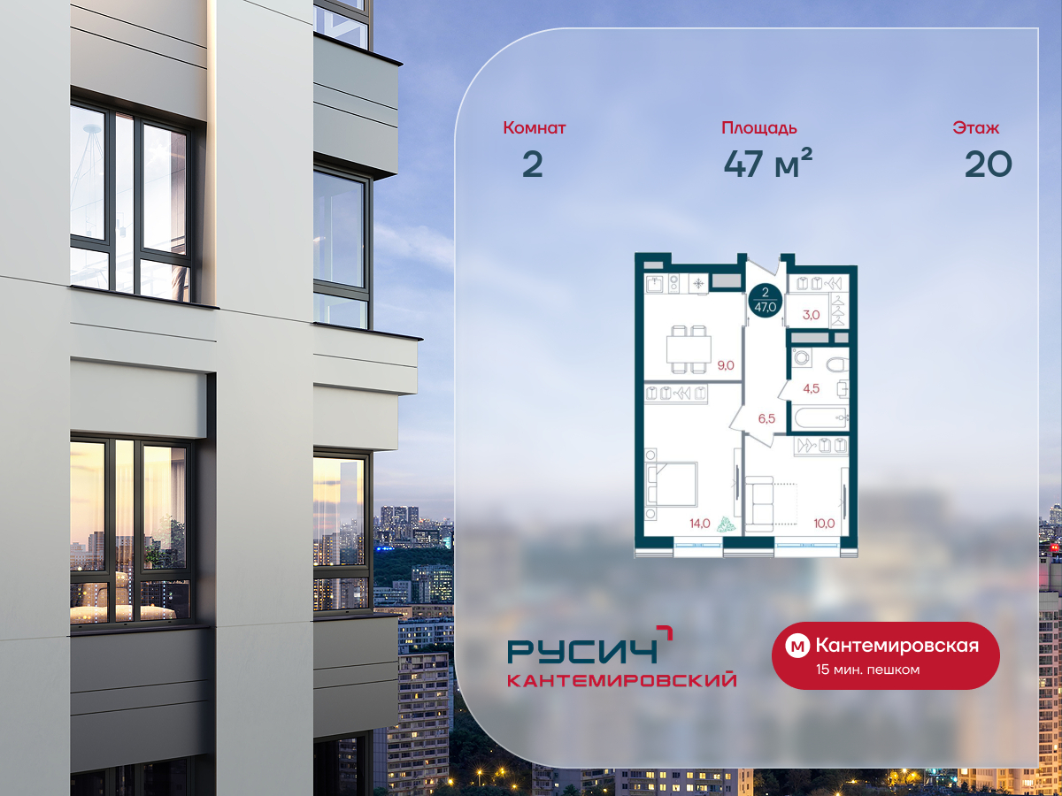 - Общая площадь: 47 м²