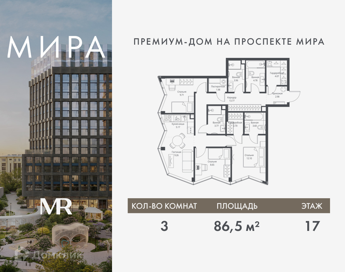 Премиальный квартал МИRA это: • Спокойный район с богатой историей и сложившейся инфраструктурой • Авторская архитектура на стыке классики и современности • Вход в парк прямо из жилого комплекса • Панорамные виды на Яузу, парки, ВДНХ и скульптуру «Рабочий и колхозница» • Удобные сервисы и безопасность для каждого резидента Расположение. Жилой квартал расположен в Алексеевском районе на северо-востоке Москвы, на второй линии домов, таким образом вы сможете дистанцироваться от шума и суеты проспекта Мира, но при этом будете жить недалеко от этой важной городской магистрали. Прямо у дома: • Парк Акведук • Река Яуза • Памятник «Рабочий и колхозница» Пешком: • 14 мин станция монорельса ул. Сергея Эйзенштейна • 16 мин м. ВДНХ На автомобиле: • 12 мин ТТК • 15 мин Садовое кольцо • 12 мин Национальный парк «Лосиный остров» Благоустройство. Концепция благоустройства от бюро «ДРУЖБА» разработана в стиле «Лесная тропа». В уютном дворе расположились словно затерянные в лесу, площадки для отдыха. Они разделяются островками с травами, кустарниками, крупными камнями и деревьями, между которыми проходят узкие песчаные тропинки с деликатной подсветкой по вечерам. Центральной точкой притяжения для жителей станет главная площадь с фонтаном, которая открывается сразу из двух входных групп. Внутренний двор МИRA: • Детская площадка с зонами для игр малышей до трех лет и детей более старшего возраста • Спортивная площадка с профессиональным оборудованием для тренировок • Декоративные перголы • Воздушный арт-объект с подсветкой, похожий на облако • Чайный домик, где в отдельном отапливаемом павильоне можно в любое время года попить кофе с соседями или устроить камерное семейное чаепитие • Зоны для работы и отдыха с гамаком под навесом, скамейками и креслами Квартиры. Большой выбор продуманных планировочных решений, квартиры с террасами и панорамными окнами, системой «Умная квартира», которая включает контроль проникновения через входную дверь и управление освещением с возможностью регулирования яркости света в кухне-гостиной. Также предусмотрены выводы для интернет-сети, IP-телефонии и домофона, обеспечивающие современный уровень коммуникаций. Система защиты от протечек воды оснащена функцией автоматического перекрытия, что предотвращает возможные аварийные ситуации. Инфраструктура и окружение. В Алексеевском районе есть огромные благоустроенные парки, магазины, гимназии с высоким рейтингом и филиалы ВУЗов, частные и государственные детские сады, модные кофейни и фитнес-центры. В квартале МИRА предусмотрены: • 2 ресторана с видом на парк Акведук • 3 кафе • фитнес-студия • подземный паркинг на 330 машино-мест