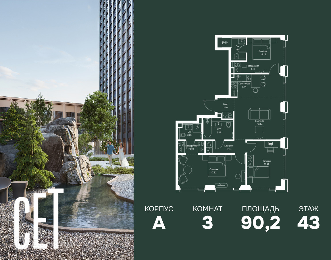 О жилом комплексе SET имеет стратегически выгодное расположение в ЗАО, в районе с большой историей и блестящим будущим: между природной зоной долины реки Сетунь и Кутузовским проспектом. Пешком: ● Метро «Давыдково» · 17 минут ● Парк «Долина реки Сетунь» · 3 минуты На машине: ● «Москва-Сити» · 15 минут ● Садовое кольцо · 20 минут ● ТЦ «Океания» · 8 минут ● ТЦ «Времена года» · 13 минут ● Сколково · 12 минут ● Гребной канал · 17 минут Архитектурный облик нового комплекса разработан «СПИЧ», бюро с мировым именем. Оригинальная геометрия новых зданий выдержана в авангардной стилистике начала XX века. В рамках возведения первой очереди предусмотрено три корпуса высотой 18, 45 и 59 этажей. На верхних этажах спроектированы общедоступные смотровые площадки с панорамным обзором на центр столицы. Корпуса будут объединены единым стилобатом, где разместятся центр культуры и досуга, медицинский центр и аптека, кафе и ресторан, продуктовые магазины. Функциональные планировочные решения В SET предусмотрены различные планировочные решения: от эргономичных студий до просторных многокомнатных квартир – с панорамным остеклением, окнами на три стороны света, мастер-спальнями и террасами, а также система «умная квартира», которая включает: ● Контроль проникновения через входную дверь ● Система управления освещением ● Система управления розетками ● Система защиты от протечек с функцией перекрытия воды ● Система управления температурой в квартире Инженерия и безопасность Вход в подъезд доступен по биометрическим считывателям Face ID, потребности резидентов обеспечат скоростные лифты с интеллектуальной системой распределения пассажиропотока и усиленным сотовым сигналом, круглосуточная связь с охраной через приложение и телефонию. На территории комплекса и паркинга, в местах общего пользования будет установлена современная система видеонаблюдения. Благоустройство Концепция благоустройства разработана студией ландшафтного дизайна L.Buro в скандинавском стиле. Здесь предусмотрен целый ряд зон для активного и расслабленного отдыха: ● Воркаут-площадка с современными уличными тренажерами ● Двухуровневый игровой комплекс для детей ● Шезлонги под навесом ● Рукотворный водоем в виде небольшого лесного озера ● Площадка для йоги ● Лаунж-зона - уличная терраса с видом на сад Премиальная инфраструктура в шаговой доступности Застройка SET включает в себя не только жилые корпуса, но и инфраструктурные объекты. Все необходимое для повседневного комфорта будет расположено в шаговой доступности: ● Фитнес-клуб с бассейном ● Детская школа искусств ● Ведущая городская школа и детский сад ● Масштабный плей-хаб для юных резидентов ● Центр культуры и досуга ● Медицинский центр ● Кафе и рестораны ● Мини-маркет Проектом предусмотрен двухуровневый подземный охраняемый паркинг на 495 машино-мест с доступом при помощи системы распознавания автомобильных номеров, с отдельным постом для подкачки шин и с зарядкой для электромобилей. На территории будет располагаться гостевая парковка на 50 мест. Статусное окружение В непосредственной близости расположены престижные учебные заведения, такие как лучшая бизнес-школа России «Сколково» и главный университет страны МГУ, а также места для отдыха, включая активити-парк «The Rink» и парк нового формата «Мещерский парк», 