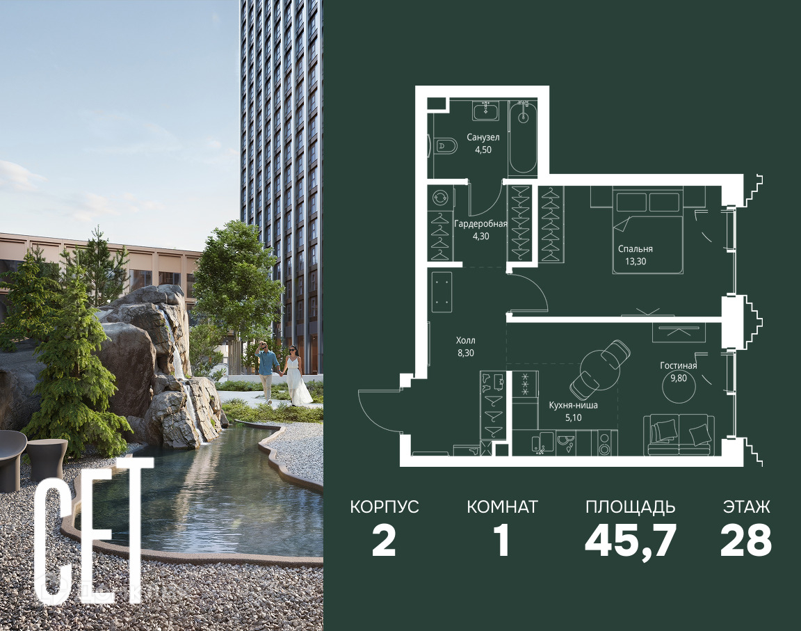 О жилом комплексе SET имеет стратегически выгодное расположение в ЗАО, в районе с большой историей и блестящим будущим: между природной зоной долины реки Сетунь и Кутузовским проспектом. Пешком: ● Метро «Давыдково» · 17 минут ● Парк «Долина реки Сетунь» · 3 минуты На машине: ● «Москва-Сити» · 15 минут ● Садовое кольцо · 20 минут ● ТЦ «Океания» · 8 минут ● ТЦ «Времена года» · 13 минут ● Сколково · 12 минут ● Гребной канал · 17 минут Архитектурный облик нового комплекса разработан «СПИЧ», бюро с мировым именем. Оригинальная геометрия новых зданий выдержана в авангардной стилистике начала XX века. В рамках возведения первой очереди предусмотрено три корпуса высотой 18, 45 и 59 этажей. На верхних этажах спроектированы общедоступные смотровые площадки с панорамным обзором на центр столицы. Корпуса будут объединены единым стилобатом, где разместятся центр культуры и досуга, медицинский центр и аптека, кафе и ресторан, продуктовые магазины. Функциональные планировочные решения В SET предусмотрены различные планировочные решения: от эргономичных студий до просторных многокомнатных квартир – с панорамным остеклением, окнами на три стороны света, мастер-спальнями и террасами, а также система «умная квартира», которая включает: ● Контроль проникновения через входную дверь ● Система управления освещением ● Система управления розетками ● Система защиты от протечек с функцией перекрытия воды ● Система управления температурой в квартире Инженерия и безопасность Вход в подъезд доступен по биометрическим считывателям Face ID, потребности резидентов обеспечат скоростные лифты с интеллектуальной системой распределения пассажиропотока и усиленным сотовым сигналом, круглосуточная связь с охраной через приложение и телефонию. На территории комплекса и паркинга, в местах общего пользования будет установлена современная система видеонаблюдения. Благоустройство Концепция благоустройства разработана студией ландшафтного дизайна L.Buro в скандинавском стиле. Здесь предусмотрен целый ряд зон для активного и расслабленного отдыха: ● Воркаут-площадка с современными уличными тренажерами ● Двухуровневый игровой комплекс для детей ● Шезлонги под навесом ● Рукотворный водоем в виде небольшого лесного озера ● Площадка для йоги ● Лаунж-зона - уличная терраса с видом на сад Премиальная инфраструктура в шаговой доступности Застройка SET включает в себя не только жилые корпуса, но и инфраструктурные объекты. Все необходимое для повседневного комфорта будет расположено в шаговой доступности: ● Фитнес-клуб с бассейном ● Детская школа искусств ● Ведущая городская школа и детский сад ● Масштабный плей-хаб для юных резидентов ● Центр культуры и досуга ● Медицинский центр ● Кафе и рестораны ● Мини-маркет Проектом предусмотрен двухуровневый подземный охраняемый паркинг на 495 машино-мест с доступом при помощи системы распознавания автомобильных номеров, с отдельным постом для подкачки шин и с зарядкой для электромобилей. На территории будет располагаться гостевая парковка на 50 мест. Статусное окружение В непосредственной близости расположены престижные учебные заведения, такие как лучшая бизнес-школа России «Сколково» и главный университет страны МГУ, а также места для отдыха, включая активити-парк «The Rink» и парк нового формата «Мещерский парк», 