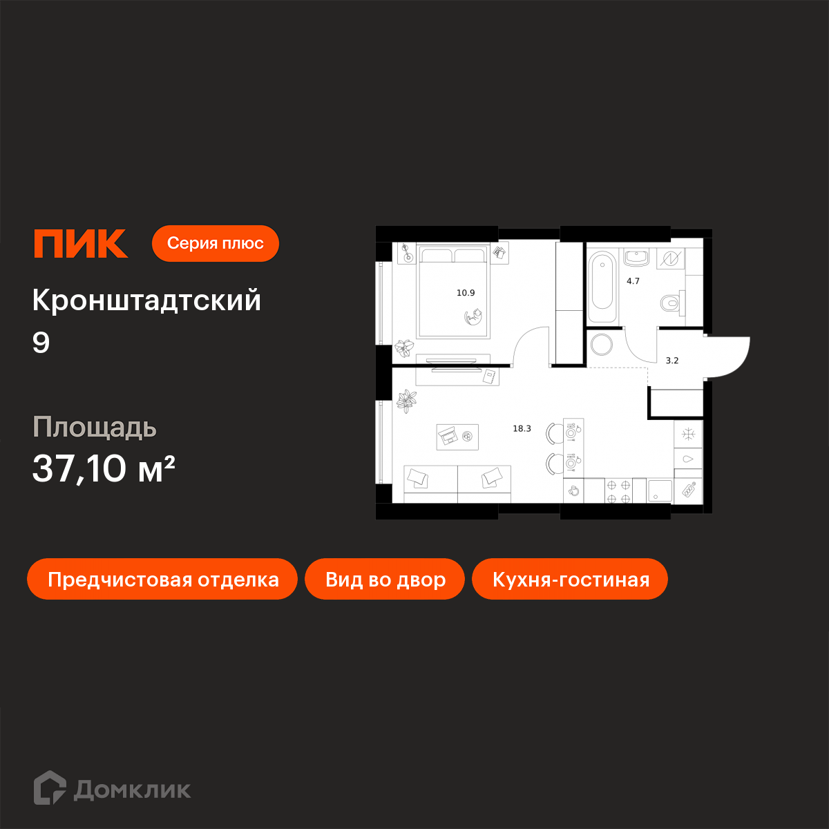Проект принадлежит «Серии плюс». В «Серию плюс» входят жилые кварталы с повышенным уровнем комфорта и уникальной архитектурой. У квартир умные планировки: можно выбрать квартиру с мастер-спальней, где есть отдельная ванная комната, с просторной кухней-гостиной, с двумя санузлами, с гардеробной или постирочной. В светлых уютных лобби с дизайнерской отделкой предусмотрены колясочная и гостевой санузел. Жилой квартал «Кронштадтский 9» возводится в Головинском — в одном из районов с лучшей экологией в Москве. Совсем рядом станция метро «Водный стадион» — до неё 3 минуты пешком. Поездка на машине до Ленинградского шоссе займёт 2 минуты, до ТТК — 10 минут, а до МКАД — 16 минут. Недалеко от жилого квартала находятся парки и пруды — спокойные места для прогулок и отдыха. В «Кронштадтском 9» можно купить квартиру в уже готовом корпусе и сразу получить ключи. В проект входит 10 корпусов с просторными и светлыми подъездами, два детских сада и подземный паркинг. Внутри квартала будут уютные дворы-парки с детскими площадками и местами для отдыха. А чуть дальше, чтобы шум не беспокоил жителей домов, мы построим спортивные площадки. Во всех квартирах в этом проекте предчистовая отделка, с которой легче реализовать ваши дизайнерские идеи. В районе, где строится «Кронштадтский 9», есть всё для комфортной жизни: школы, сады, вузы, магазины и крупные торговые центры «Водный» и «Метрополис». В 15 минутах ходьбы — парк у Головинских прудов, в 18 минутах — парк «Дружба». Оба для прогулок, пробежек и отдыха от дома и работы. Ключевая особенность новых корпусов проекта — это особый архитектурный образ, разработанный бюро М.А.М. Здания привлекают внимание контрастом светлых фасадных поверхностей с тёмными, более детализированными элементами. Архитектурные приёмы формируют связь с городским контекстом: низкоэтажные корпуса естественно вписываются в окружающий ландшафт, в то время как 32-этажная башня добавляет вертикальный акцент, усиливающий общий облик квартала. В «Кронштадтском 9» можно выбрать квартиру с угловыми окнами: они визуально расширят комнату и сделают пространство легче и светлее. В каждом новом корпусе будут террасы: с одной из них, расположенной в башне-доминанте, будет открываться ошеломляющий вид на реку Химку. А в 12-этажных корпусах будут балконы — обычные открытые и французские. В «Кронштадтском 9» умные планировки: вы сами выбираете, как их использовать, чтобы ваша квартира была максимально комфортной именно для вас. Например, постирочная может стать студией звукозаписи, а зона для гардероба — кабинетом. В новых корпусах есть квартиры с кухней-нишей, сквозным санузлом и мастер-спальней с собственной ванной. Квартиры продаются с предчистовой отделкой. Это значит, что к моменту получения ключей в доме уже закончатся самые грязные и шумные работы, а вам будет легче реализовать дизайнерские идеи. Рядом с проектом есть всё необходимое. В паре минут пешком — торговые центры «Гавань» и «Водный», а в 7 минутах на машине — большой ТРЦ «Флотилия». В шаговой доступности аптеки и детская городская поликлиника. Доехать до взрослой поликлиники можно за несколько минут. Вокруг несколько интересных мест для прогулок, в том числе с детьми. Можно арендовать лодку или просто понаблюдать за плывущими яхтами и парусниками на Северном речном вокзале,