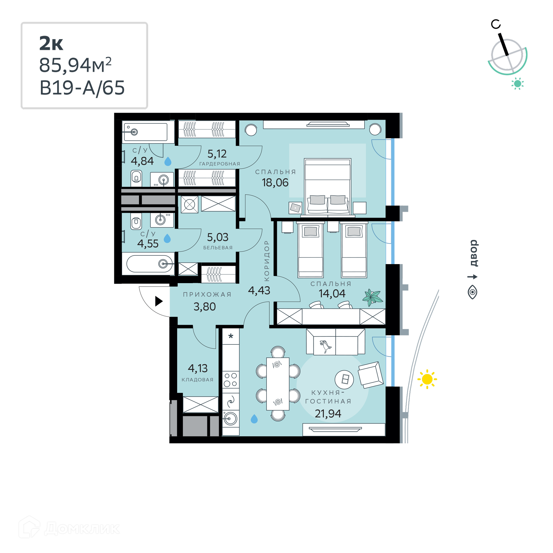 - ✅ Кухня: 21.94 м² — эргономичное пространство.