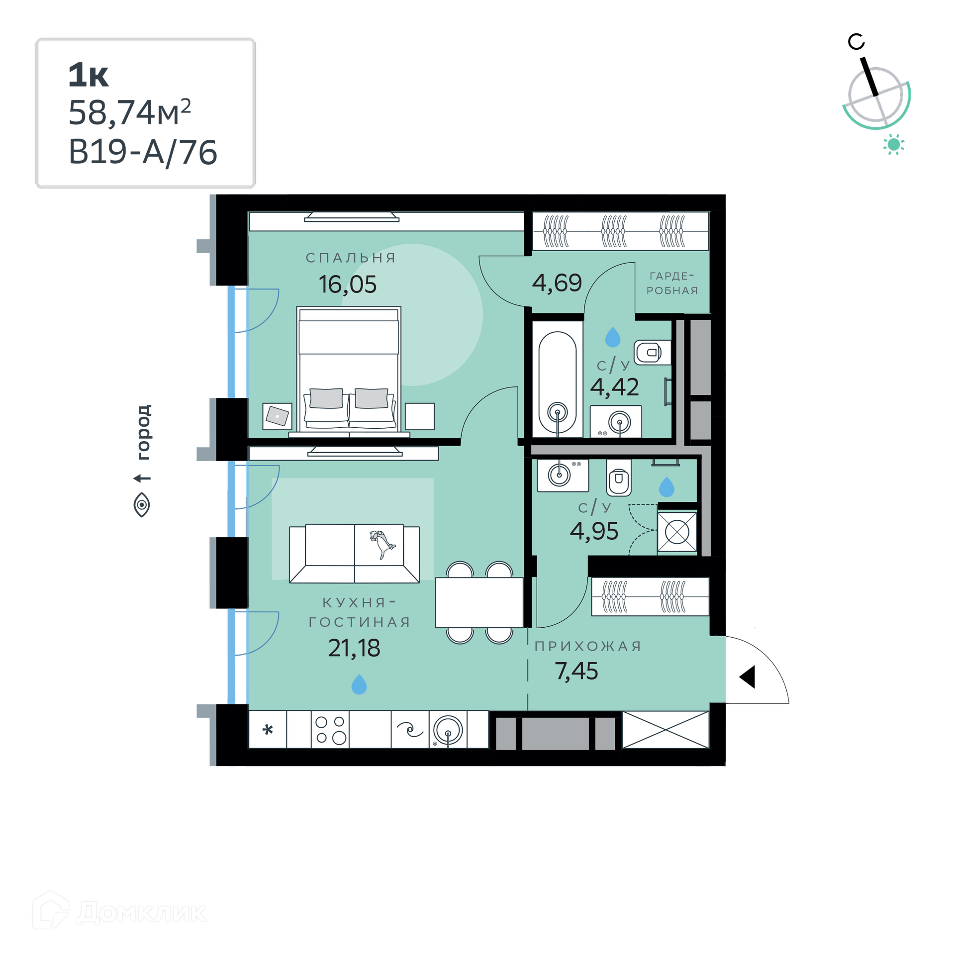 - ✅ Светлая жилая площадь: 16.05 м².
