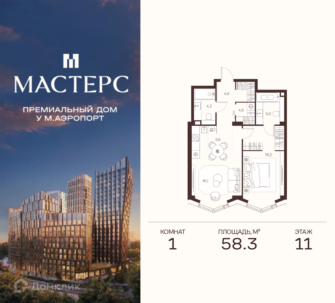 Планировка 1 комн. в Премиальный дом МАСТЕРС