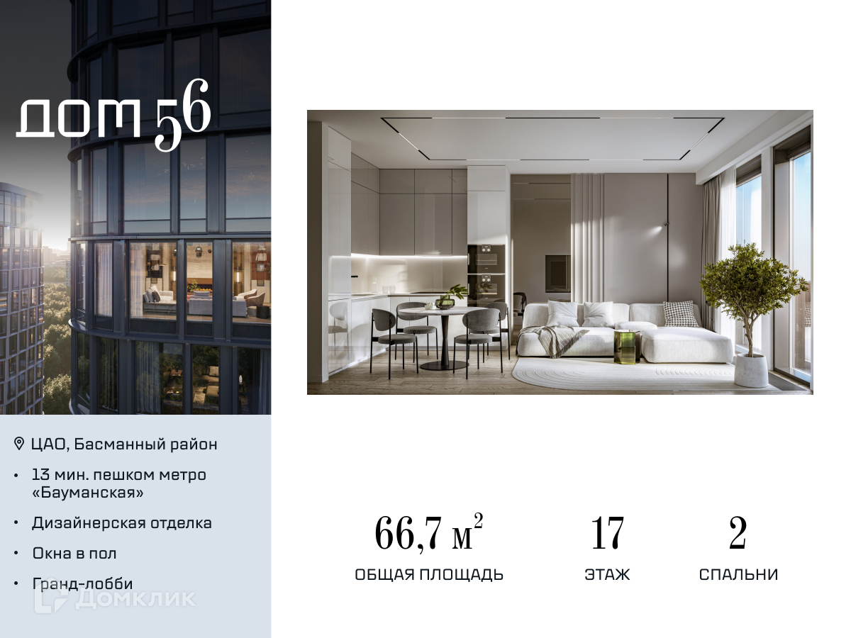«Дом 56» — это новый жилой квартал премиум-класса от ГК "Галс-Девелопмент" в Басманном районе рядом с метро "Бауманская". Футуристическая архитектура трех башен отсылает нас в будущее. Комплекс-визионер «Дом 56» станет органичным продолжением современной научно-креативной среды Басманного района. В Басманном районе сложилась особая среда: здесь историческая Москва перетекает в столицу XXI века, где старинные церкви и уютные парки соседствуют с креативными динамичными арт-кластерами, а обновленный сад имени Н.Э. Баумана стал модной альтернативой 300-летнему Лефортовскому парковому ансамблю. «Дом 56» расположен на ул. Фридриха Энгельса, в 12-15 минутах пешком от станций метро «Бауманская» и «Электрозаводская». Рядом находятся важные городские магистрали — ТТК, набережная реки Яузы и Бакунинская улица, переходящая в Спартаковскую и Маросейку. Улица Фридриха Энгельса за пару минут выведет вас на ТТК. Набережная Яузы — лучший способ за считаные минуты попасть на Садовое кольцо и в район Китай-города. Фасады, облицованные металлическими панелями с оттенками меди, стали и никеля, выглядят одетыми в материал будущего. Футуристическое впечатление от дома усиливает обилие стекла — окна в пол будут в каждой квартире. Три корпуса «Дома 56» формируют приватное внутреннее пространство только для резидентов. Защищенная изящным ограждением благоустроенная территория предусматривает множество сценариев досуга и отдыха: здесь есть детская площадка для разных возрастов и активностей, зона для утреннего воркаута и уютный лаундж с качелями под скульптурным навесом. Жилой квартал оснащён первоклассными инженерными системами. Входы на территорию, в здание и паркинг оборудованы системой контроля и управления доступом. С любого этажа в лобби и паркинг спускаются быстрые и бесшумные лифты премиального бренда. Премиум-квартал впечатляет выбором квартир на самый изысканный вкус. Среди множества уникальных форматов можно выбрать самые редкие — квартиры с большим количеством окон и просторными террасами, выходящими во двор и на улицу Фридриха Энгельса. В «Доме 56» предлагаются квартиры как с готовой отделкой, так и без нее. В башне 1 можно выбрать квартиру с отделкой в двух вариантах: Smart White и Casual Grey. Квартиры во 2 и 3 башне предлагаются без отделки с возможностью объединения лотов и создания индивидуального дизайн-проекта.