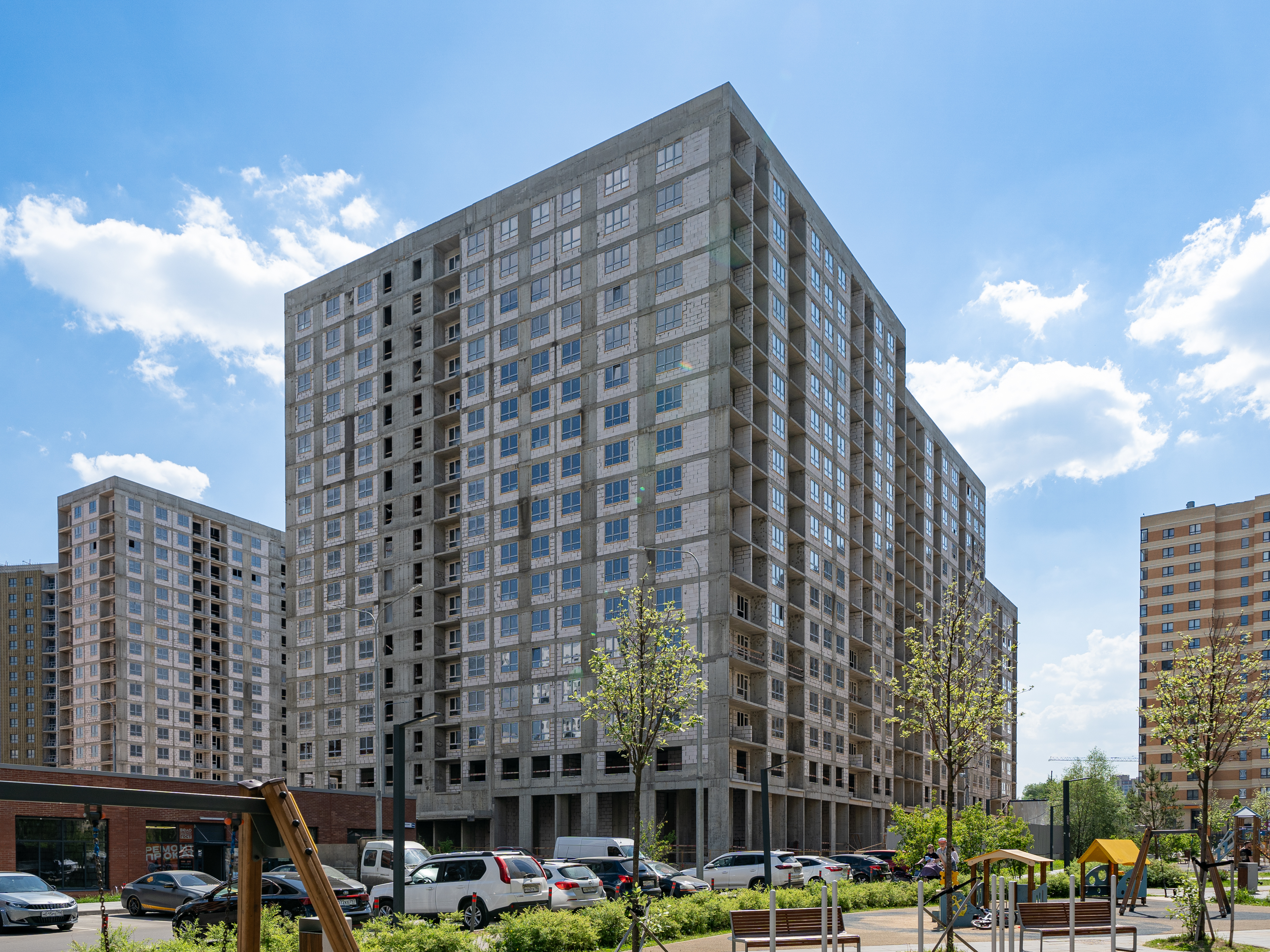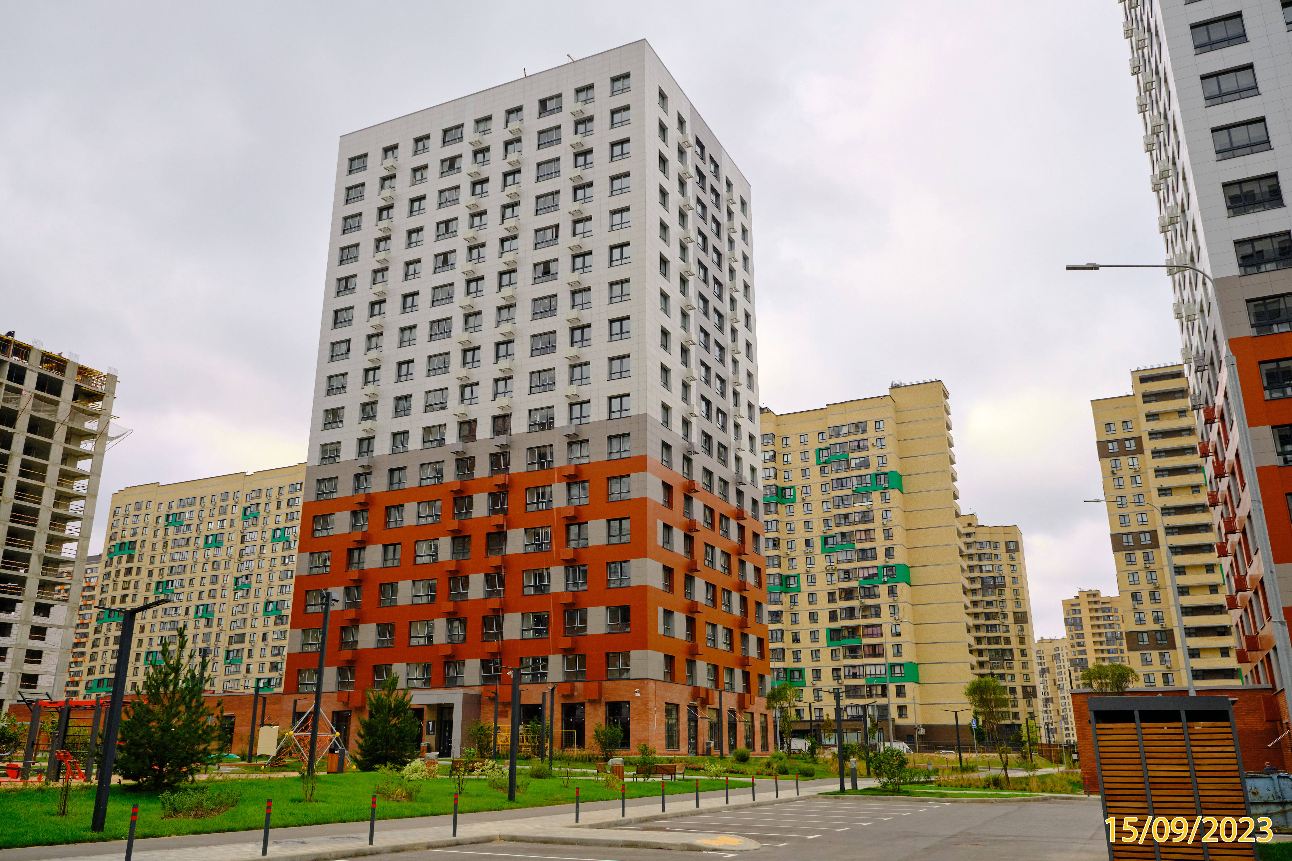 Во дворах проложены пешеходные и велосипедные маршруты, посажены деревья, клумбы с цветами и декоративные травы. Детские площадки оборудованы беседками для отдыха родителей, в спортивных зонах – современные тренажеры, турники и специальное покрытие. Рядом находится скейтпарк, а пешеходные дорожки плавно переходят в городскую площадь.